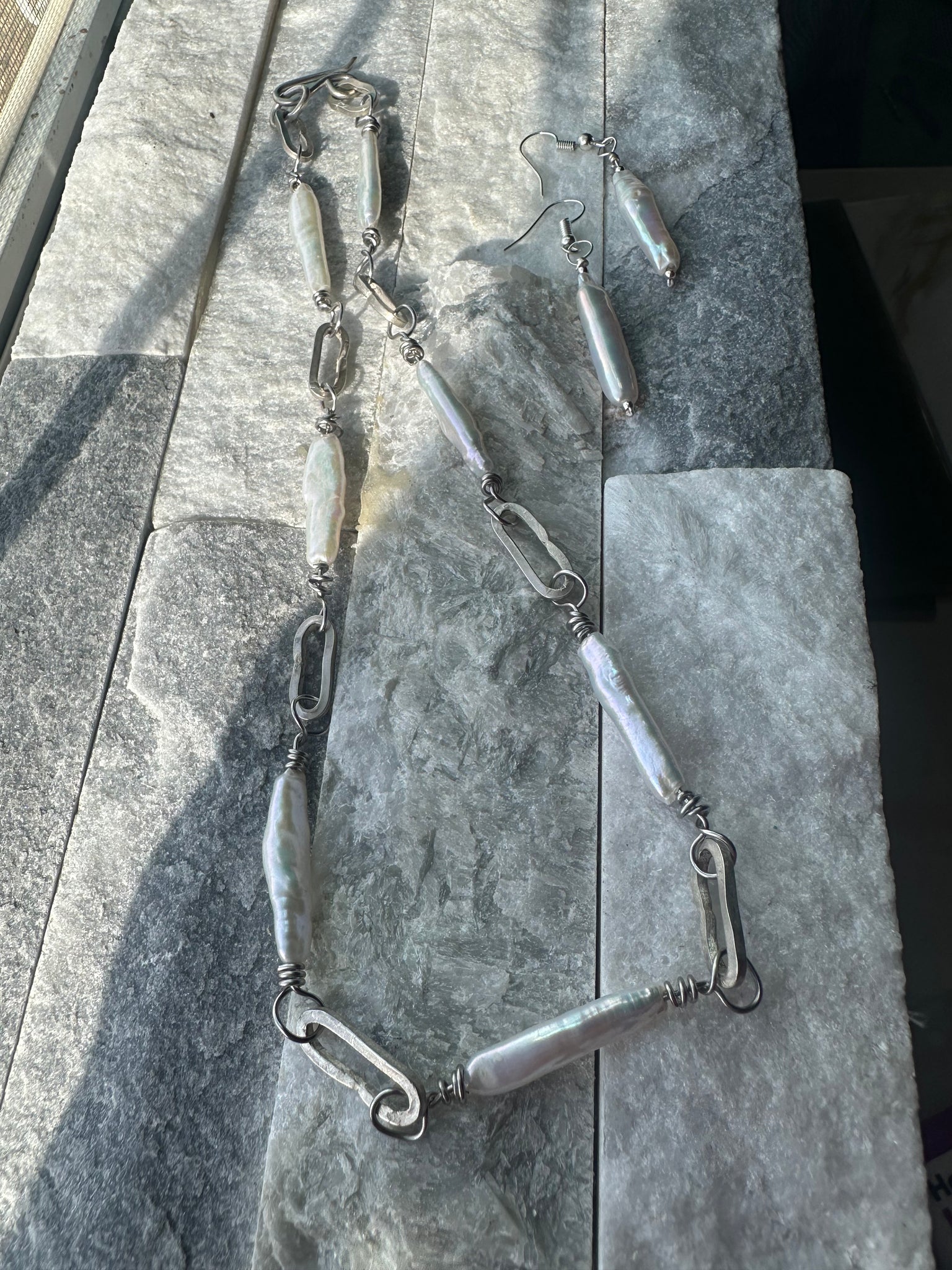 Designed as a statement without excess, this necklace carries weight in both form and feeling. The pearls bring luster and organic movement; the silver provides structure and grounding. Together, they create a modern heirloom—timeless, confident, and meant to be worn and loved.