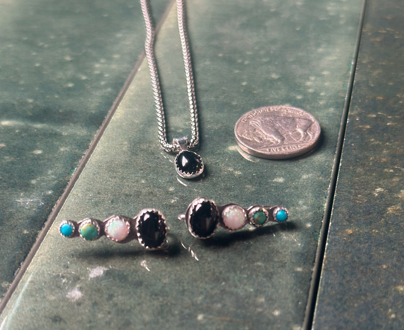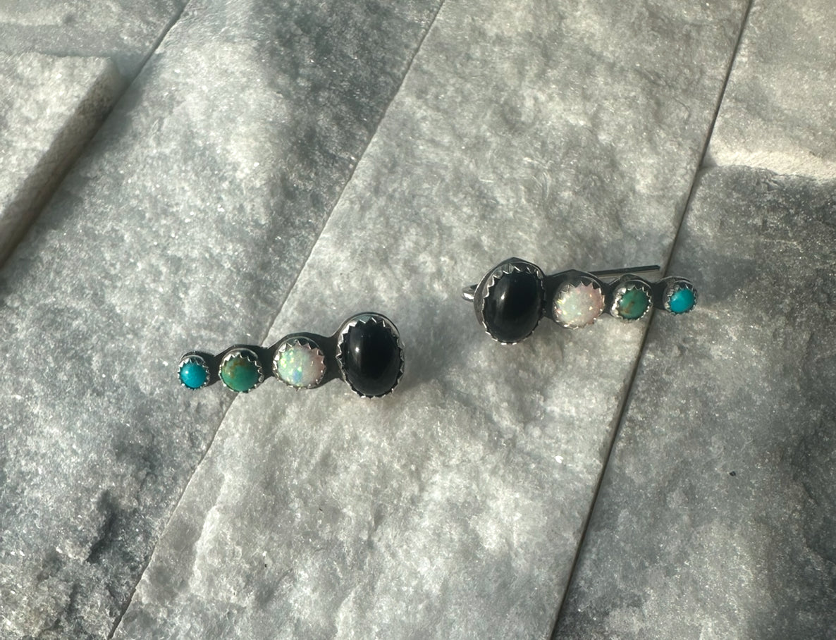 This ear crawler comes as a set with two ear crawlers. The stones are Black Onyx, Kyocera Opal and Kingman Turquoise.